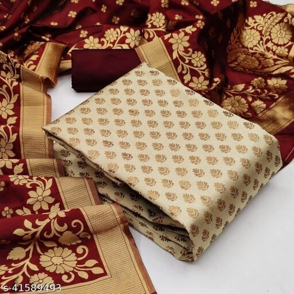 TOP: BANARASI SILK (2. 5 MTR) BOTTOM:HEAVY SILK (2.5 Mtr) DUPATTA:JECQUARD WEAVING (2.10 MTR) BOTTOM COLOR WILL SAME COLOR OF DUPATTA