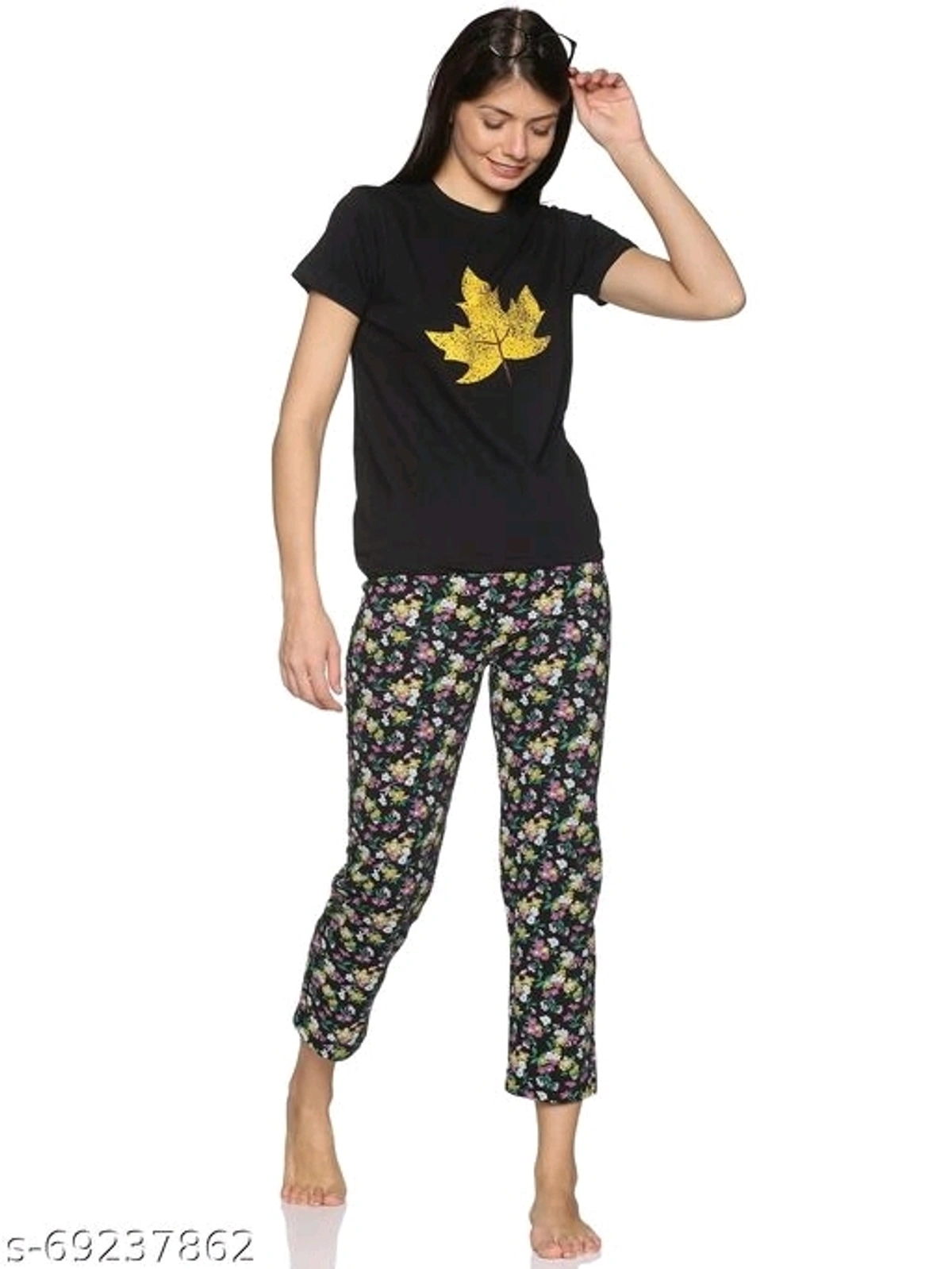 black leaf nightsuit Name: black leaf nightsuit Top Fabric: Cotton Bottom Fabric: Cotton Top Type: Tshirt Bottom Type: Pyjamas Sizes: S (Top Bust Size: 36 in, Top Length Size: 26 in, Bottom Waist Size: 32 in, Bottom Length Size: 37 in) XL (Top Bust Size: 42 in, Top Length Size: 28 in, Bottom Waist Size: 38 in, Bottom Length Size: 40 in) L (Top Bust Size: 40 in, Top Length Size: 28 in, Bottom Waist Size: 36 in, Bottom Length Size: 39 in) M (Top Bust Size: 38 in, Top Length Size: 27 in, Bottom Waist Size: 34 in, Bottom Length Size: 38 in) Country of Origin: India