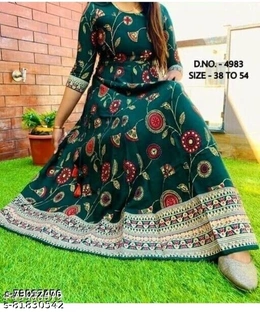 Bottle Green print Gowns Name: Bottle Green print Gowns Fabric: Rayon Sleeve Length: Three-Quarter Sleeves Pattern: Printed Combo of: Single Sizes: XL, L, M, XXL Beautiful Sanganeri Printed Gown Print-Gold and Red free delivery return policy 6 days