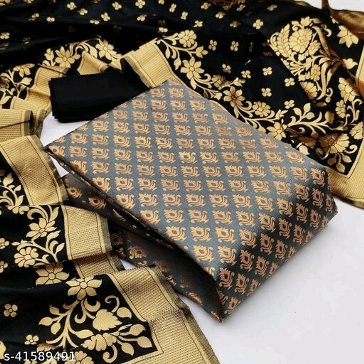 TOP: BANARASI SILK (2. 5 MTR) BOTTOM:HEAVY SILK (2.5 Mtr) DUPATTA:JECQUARD WEAVING (2.10 MTR) BOTTOM COLOR WILL SAME COLOR OF DUPATTA