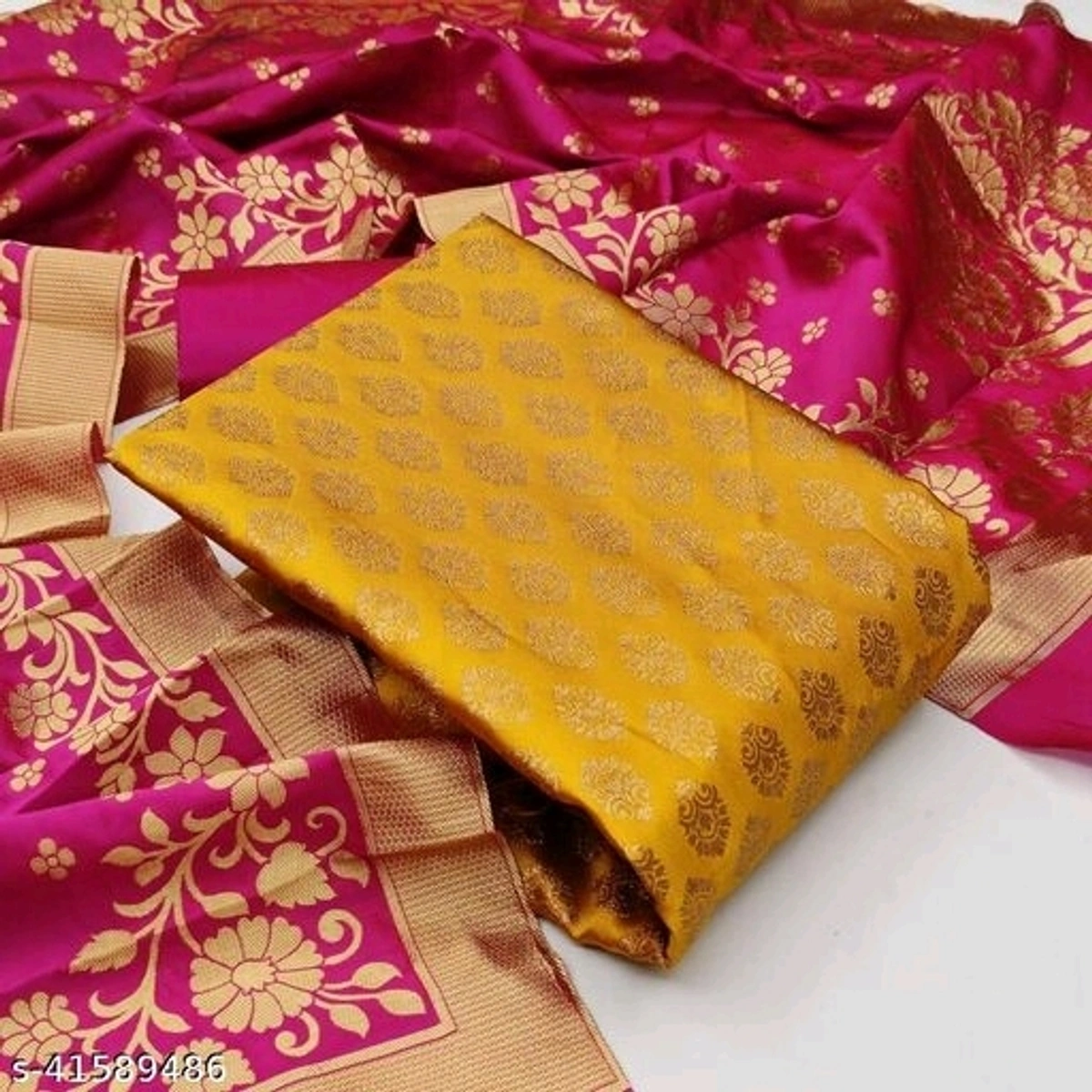 TOP: BANARASI SILK (2. 5 MTR) BOTTOM:HEAVY SILK (2.5 Mtr) DUPATTA:JECQUARD WEAVING (2.10 MTR) BOTTOM COLOR WILL SAME COLOR OF DUPATTA