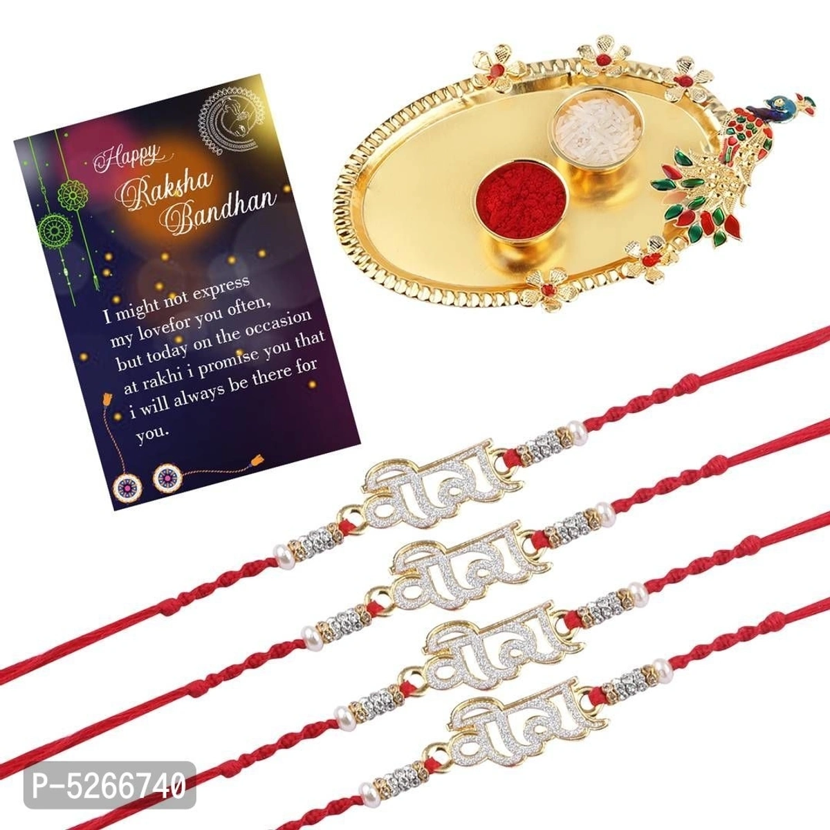 Rakhi Bracelet "VEERA" Diamond Stud Pendant Rakhi with Kankawati Pooja Thali Roli Chawal 1 Greeting Card For Bhaiya/Brother/Bhai Pack Of 4