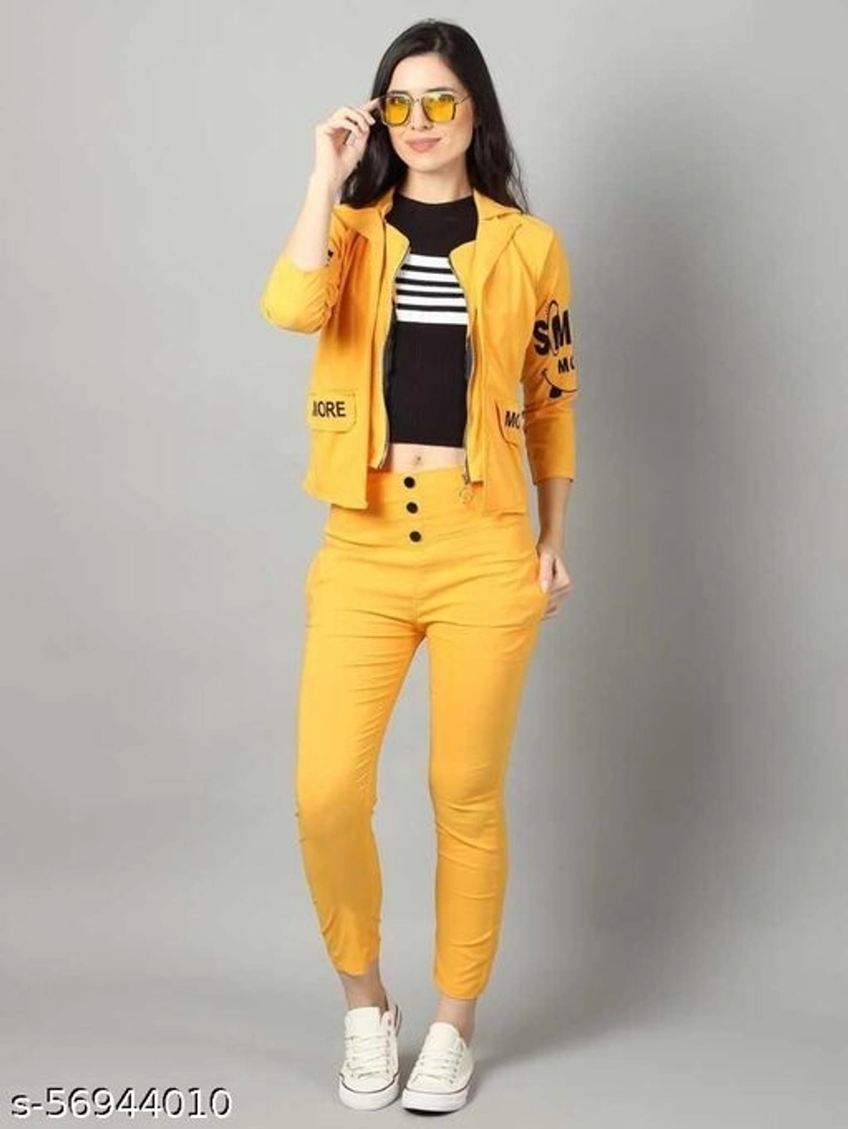 @JACKET AND TROUSER - YELLOW Name: @JACKET AND TROUSER - YELLOW Top Fabric: Polyester Bottom Fabric: Polyester Sleeve Length: Three-Quarter Sleeves Multipack: 1 Add on: Jacket Sizes: XS, S (Top Bust Size: 34 in, Top Length Size: 19 in, Top Waist Size: 32 in, Bottom Waist Size: 28 in, Bottom Hip Size: 32 in, Bottom Length Size: 36 in) M (Top Bust Size: 36 in, Top Length Size: 19 in, Top Waist Size: 34 in, Bottom Waist Size: 30 in, Bottom Hip Size: 34 in, Bottom Length Size: 36 in) L (Top Bust Size: 38 in, Top Length Size: 19 in, Top Waist Size: 36 in, Bottom Waist Size: 32 in, Bottom Hip Size: 36 in, Bottom Length Size: 36 in) XL (Top Bust Size: 40 in, Top Length Size: 19 in, Top Waist Size: 38 in, Bottom Waist Size: 34 in, Bottom Hip Size: 38 in, Bottom Length Size: 36 in) Country of Origin: India