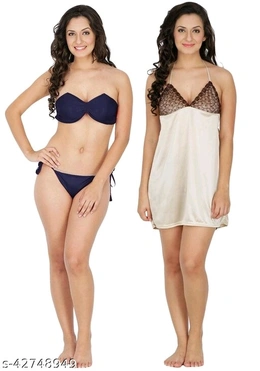 Klamotten Women Nightwear And Bikini Set Name: Klamotten Women Nightwear And Bikini Set Fabric: Satin Sleeve Length: Sleeveless Pattern: Solid Multipack: 2 Sizes: Free Size (Bust Size: 38 in, Length Size: 27 in, Waist Size: 34 in, Hip Size: 36 in) Country of Origin: India