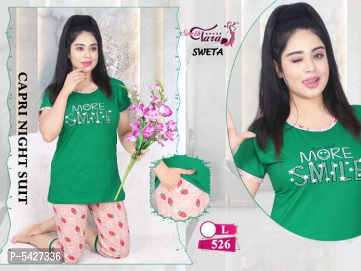 *Women's Cotton Hosiery Night Top Capri Set* *Size*: L(Bust - 38.0 inches) XL(Bust - 40.0 inches) 2XL(Bust - 42.0 inches) *Color*: Multicoloured *Fabric*: Cotton Hosiery *Type*: Lounge Set *Style*: Printed *COD Available* *Free and Easy Returns*: Within 6 days of delivery. No questions asked