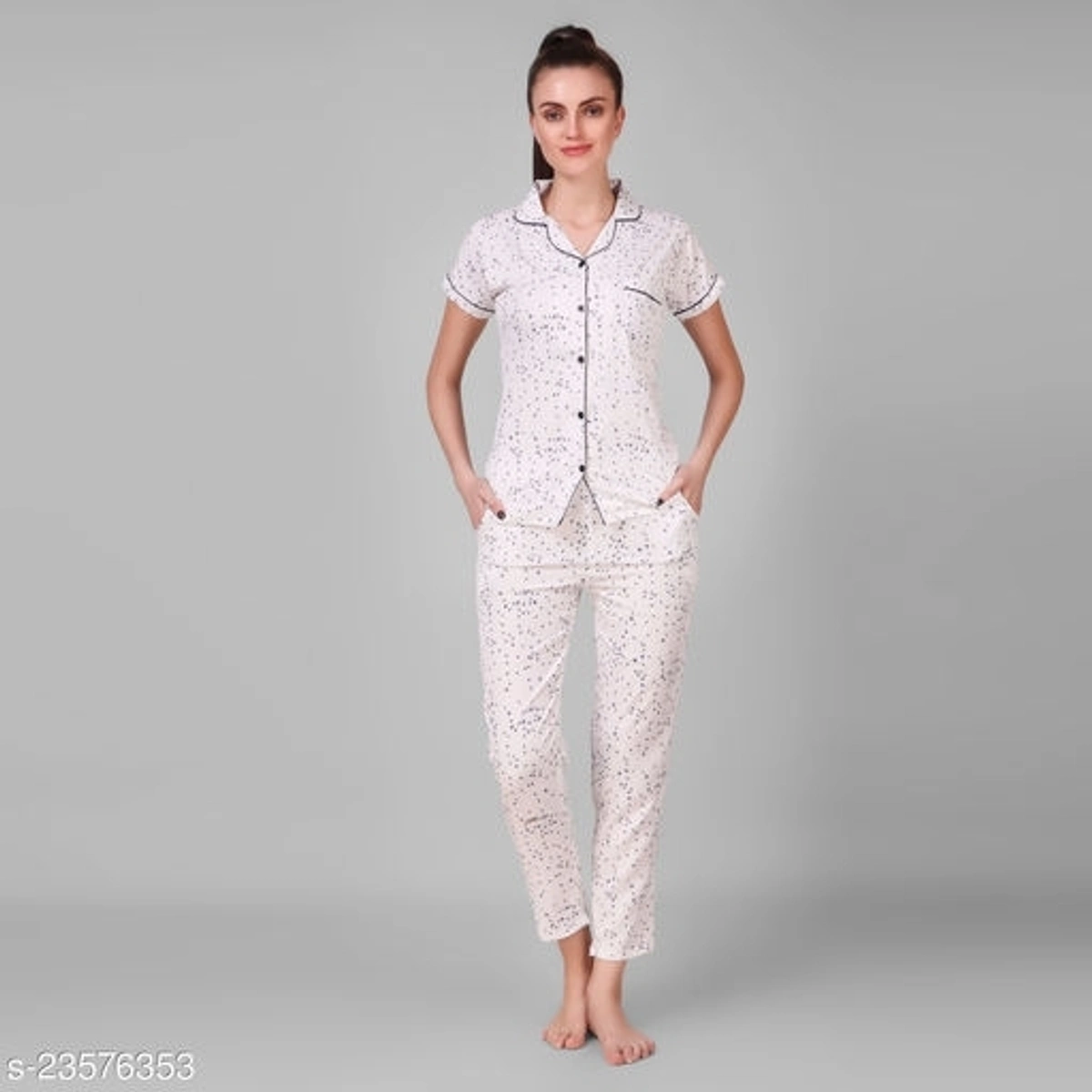 MYSAA STYLISH NIGHT SUIT FOR WOMEN Name: MYSAA STYLISH NIGHT SUIT FOR WOMEN Top Fabric: Crepe Bottom Fabric: Crepe Top Type: Shirt Bottom Type: Pyjamas Sleeve Length: Short Sleeves Pattern: Printed Multipack: 1 Sizes: M (Top Bust Size: 38 in, Top Length Size: 28 in, Bottom Waist Size: 29 in, Bottom Length Size: 39 in) Country of Origin: India