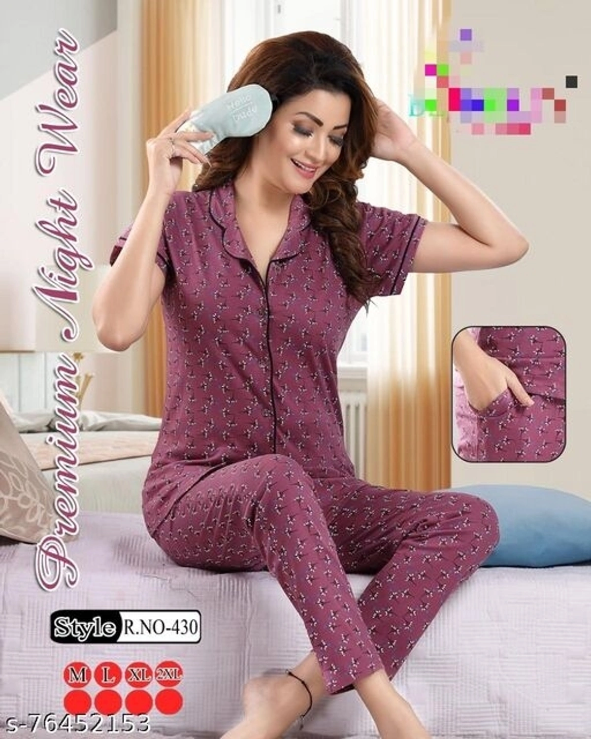 NIGHT SUITS Name: NIGHT SUITS Top Fabric: Hosiery Bottom Fabric: Hosiery Top Type: Shirt Bottom Type: Pyjamas Sleeve Length: Short Sleeves Pattern: Printed Multipack: 1 Sizes: XL (Top Bust Size: 40 in, Top Length Size: 28 in, Bottom Waist Size: 34 in, Bottom Length Size: 39 in) L (Top Bust Size: 38 in, Top Length Size: 27 in, Bottom Waist Size: 32 in, Bottom Length Size: 38 in) XXL (Top Bust Size: 42 in, Top Length Size: 29 in, Bottom Waist Size: 36 in, Bottom Length Size: 40 in) M (Top Bust Size: 36 in, Top Length Size: 26 in, Bottom Waist Size: 30 in, Bottom Length Size: 37 in) A4U Girls & Women Kollar shirt style Premium Night Suits