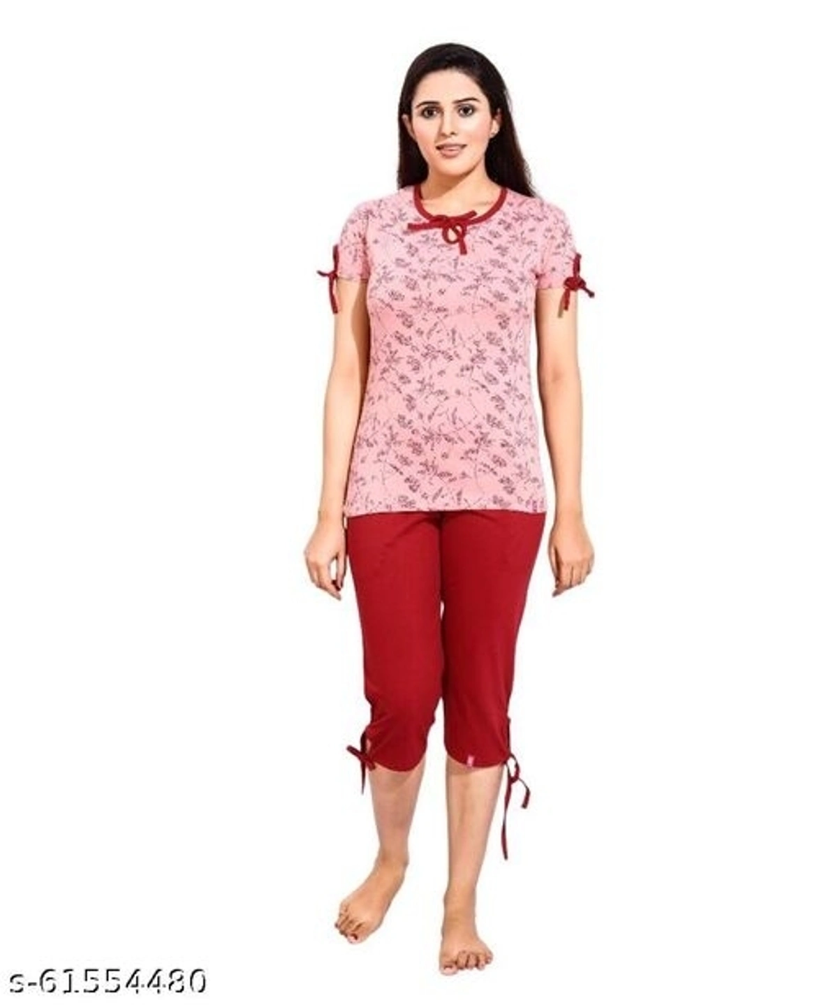 OVEL NECK-CAPRI- CHERRY Name: OVEL NECK-CAPRI- CHERRY Top Fabric: Cotton Bottom Fabric: Cotton Sleeve Length: Short Sleeves Multipack: 1 Sizes: S (Top Bust Size: 16 in, Top Length Size: 24 in, Bottom Waist Size: 11 in, Bottom Length Size: 26 in) M (Top Bust Size: 17 in, Top Length Size: 25 in, Bottom Waist Size: 12 in, Bottom Length Size: 27 in) L (Top Bust Size: 18 in, Top Length Size: 26 in, Bottom Waist Size: 13 in, Bottom Length Size: 27 in) XL (Top Bust Size: 19 in, Top Length Size: 28 in, Bottom Waist Size: 14 in, Bottom Length Size: 28 in) XXL (Top Bust Size: 20 in, Top Length Size: 29 in, Bottom Waist Size: 15 in, Bottom Length Size: 29 in) Country of Origin: India