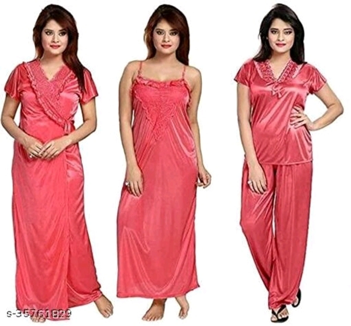 OVIDA Women's Satin Solid Maxi Nighty Top And Pajam With Robe, (Tomato) Name: OVIDA Women's Satin Solid Maxi Nighty Top And Pajam With Robe, (Tomato) Fabric: Satin Sleeve Length: Short Sleeves Pattern: Lace Multipack: 4 Add ons: Top & Bottom Sizes: Free Size, XL, L At OVIDA, We think long and hard about the foundational pieces everyone needs in their closet. Then, we design the best version of these pieces with attention to feet, fabric and feminine design. We make every effort to ensure the quality of our products. Country of Origin: India
