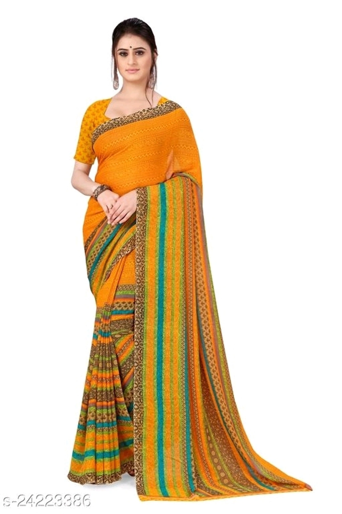 Printed, Daily Wear Georgette Saree with unstitched blouse piece Name: Printed, Daily Wear Georgette Saree with unstitched blouse piece Saree Fabric: Georgette Blouse: Running Blouse Blouse Fabric: Georgette Blouse Pattern: Printed Multipack: Single Sizes: Free Size (Saree Length Size: 5.2 m, Blouse Length Size: 0.8 m) Country of Origin: India Free and fast delivery Easy Returns Available In Case Of Any Issue return policy 6 Days