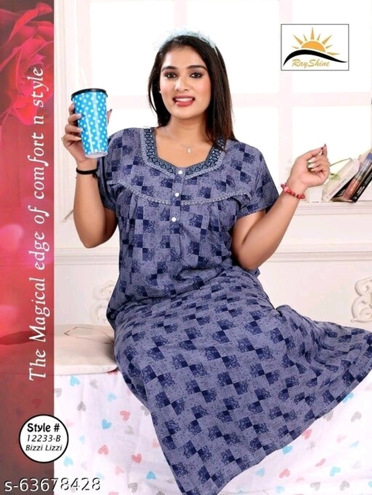 RayShine Nighty / Night Gown / Night Dress Name: RayShine Nighty / Night Gown / Night Dress Fabric: Cotton Blend Multipack: 1 Sizes: Free Size (Bust Size: 48 in, Length Size: 58 in) RayShine Nighty / Night Gown / Night Dress