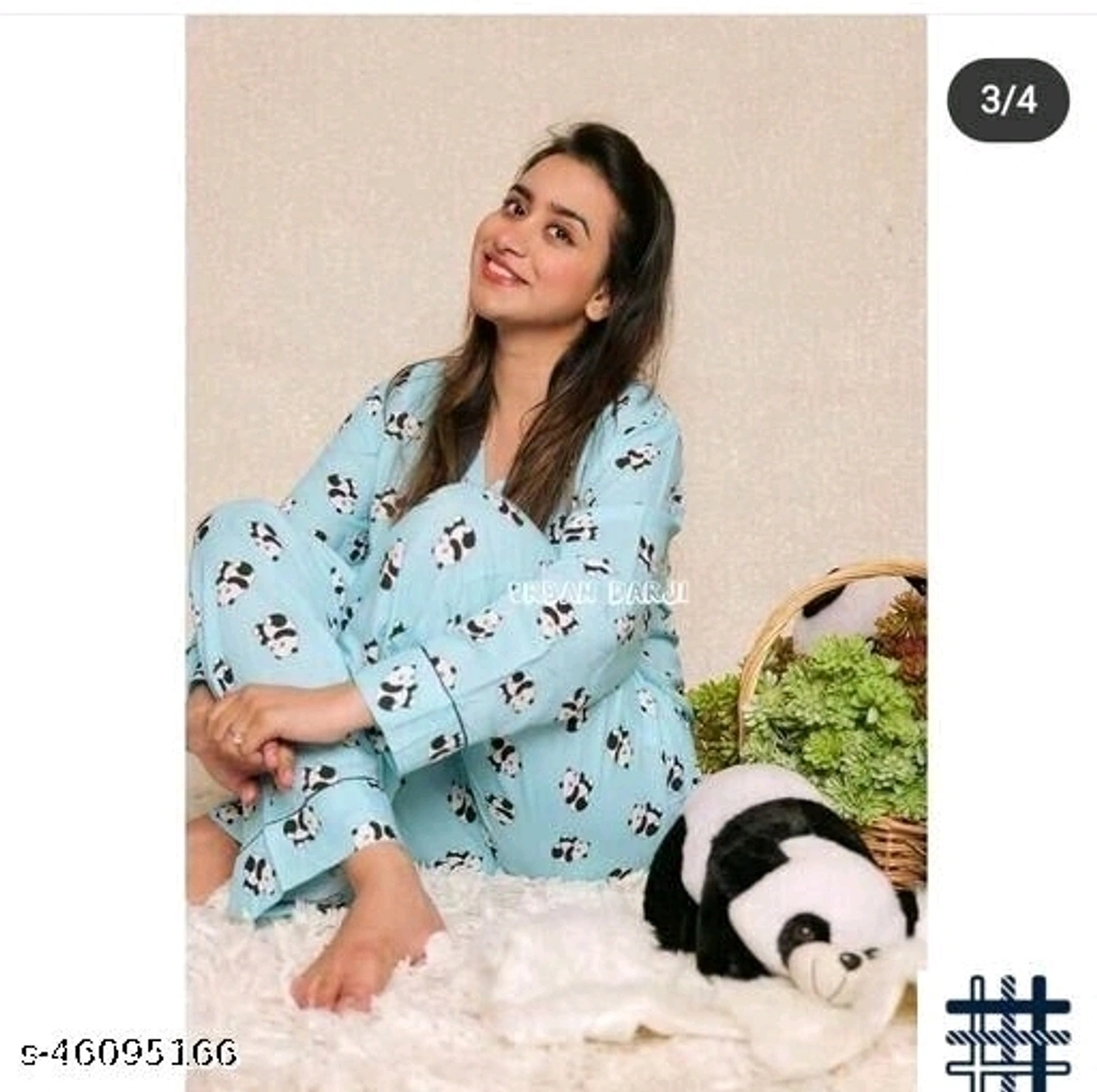 Reyon night suit Name: Reyon night suit Top Fabric: Rayon Bottom Fabric: Rayon Top Type: Regular Top Bottom Type: Pyjamas Sleeve Length: Three-Quarter Sleeves Pattern: Printed Multipack: 1 Sizes: XL (Top Bust Size: 42 in, Top Length Size: 30 in, Bottom Waist Size: 40 in, Bottom Hip Size: 44 in, Bottom Length Size: 38 in) L (Top Bust Size: 40 in, Top Length Size: 30 in, Bottom Waist Size: 38 in, Bottom Hip Size: 42 in, Bottom Length Size: 38 in) M (Top Bust Size: 38 in, Top Length Size: 30 in, Bottom Waist Size: 36 in, Bottom Hip Size: 40 in, Bottom Length Size: 38 in) XXL (Top Bust Size: 44 in, Top Length Size: 30 in, Bottom Waist Size: 42 in, Bottom Hip Size: 46 in, Bottom Length Size: 38 in) Reyon Night Suit Country of Origin: India