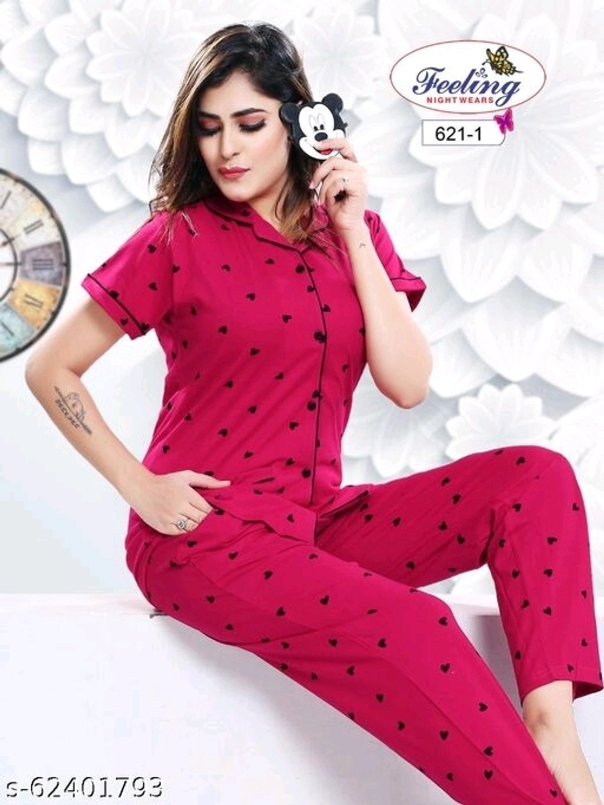 Stylish Collar Night Suits Name: Stylish Collar Night Suits Top Fabric: Hosiery Bottom Fabric: Hosiery Top Type: Shirt Bottom Type: Pyjamas Sleeve Length: Short Sleeves Pattern: Printed Multipack: 1 Sizes: XL (Top Bust Size: 40 in, Top Length Size: 29 in, Bottom Waist Size: 36 in, Bottom Length Size: 40 in) L (Top Bust Size: 38 in, Top Length Size: 28 in, Bottom Waist Size: 34 in, Bottom Length Size: 40 in) M (Top Bust Size: 36 in, Top Length Size: 27 in, Bottom Waist Size: 32 in, Bottom Length Size: 40 in) XXL (Top Bust Size: 42 in, Top Length Size: 29 in, Bottom Waist Size: 38 in, Bottom Length Size: 40 in) Heart printed shirt pyjama night suits. 100% cotton shinker material. Stylish and classy look. Bottom and shirt both have pocket. Comfortable in all seasons. Country of Origin: India