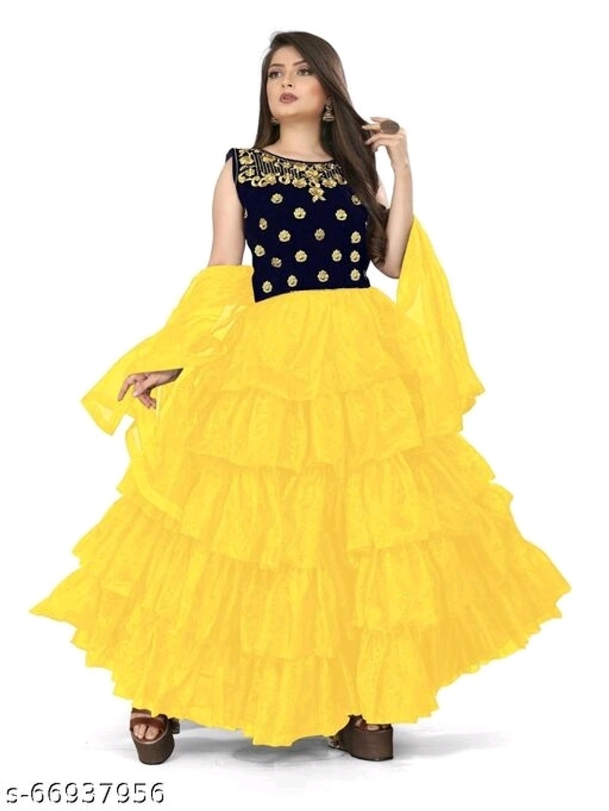 Name: Stylish soft Net & Velvet Embroidery fency design long gowns & dupatta Yellow