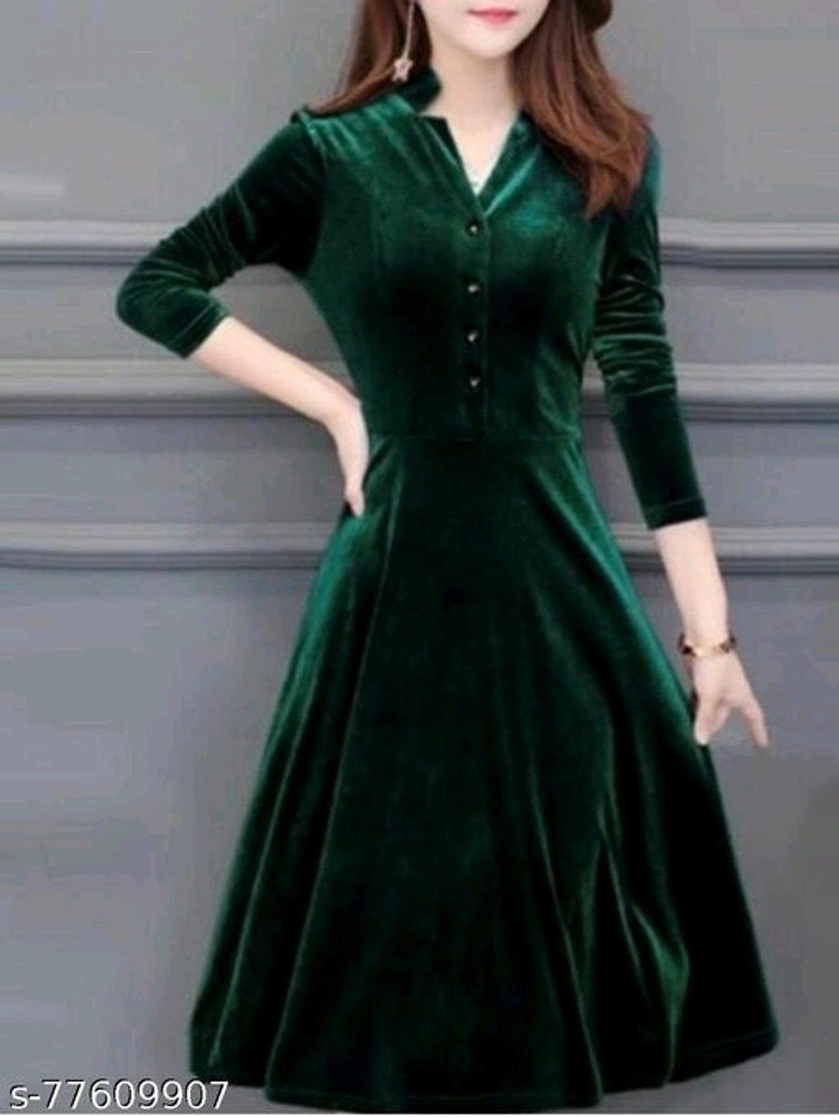 TB_1100_VELVET DRESS_GREEN Name: TB_1100_VELVET DRESS_GREEN Fabric: Velvet Sleeve Length: Three-Quarter Sleeves Multipack: 1 Sizes: S (Bust Size: 36 in, Length Size: 42 in) XL (Bust Size: 42 in, Length Size: 42 in) XS (Bust Size: 34 in, Length Size: 42 in) L (Bust Size: 40 in, Length Size: 42 in) M (Bust Size: 38 in, Length Size: 42 in) XXL (Bust Size: 44 in, Length Size: 42 in) free and fast delivery return policy 6 days