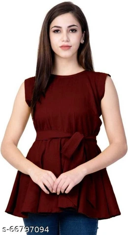 Tops & Tunics Name: Tops & Tunics Fabric: Rayon Sleeve Length: Short Sleeves Pattern: Solid Multipack: 1 Sizes: S (Bust Size: 36 in, Length Size: 26 in) XL (Bust Size: 42 in, Length Size: 27 in) XS (Bust Size: 34 in, Length Size: 25 in) L (Bust Size: 40 in, Length Size: 27 in) M (Bust Size: 38 in, Length Size: 26 in) XXL (Bust Size: 44 in, Length Size: 28 in) 1 ) Neck : Round 2 ) Sleeve Style : Regular Sleeves 3 ) Sleeve Length : Short Sleeve 4 ) Fit : Regular 5 ) Fabric : Rayon 6 ) Type : Western Top 7 ) Pattern : Solid 8 ) Pack of : 1 9 ) Length : Hip Length 10 ) Care : Dry Clean Only free delivery return policy 6 days