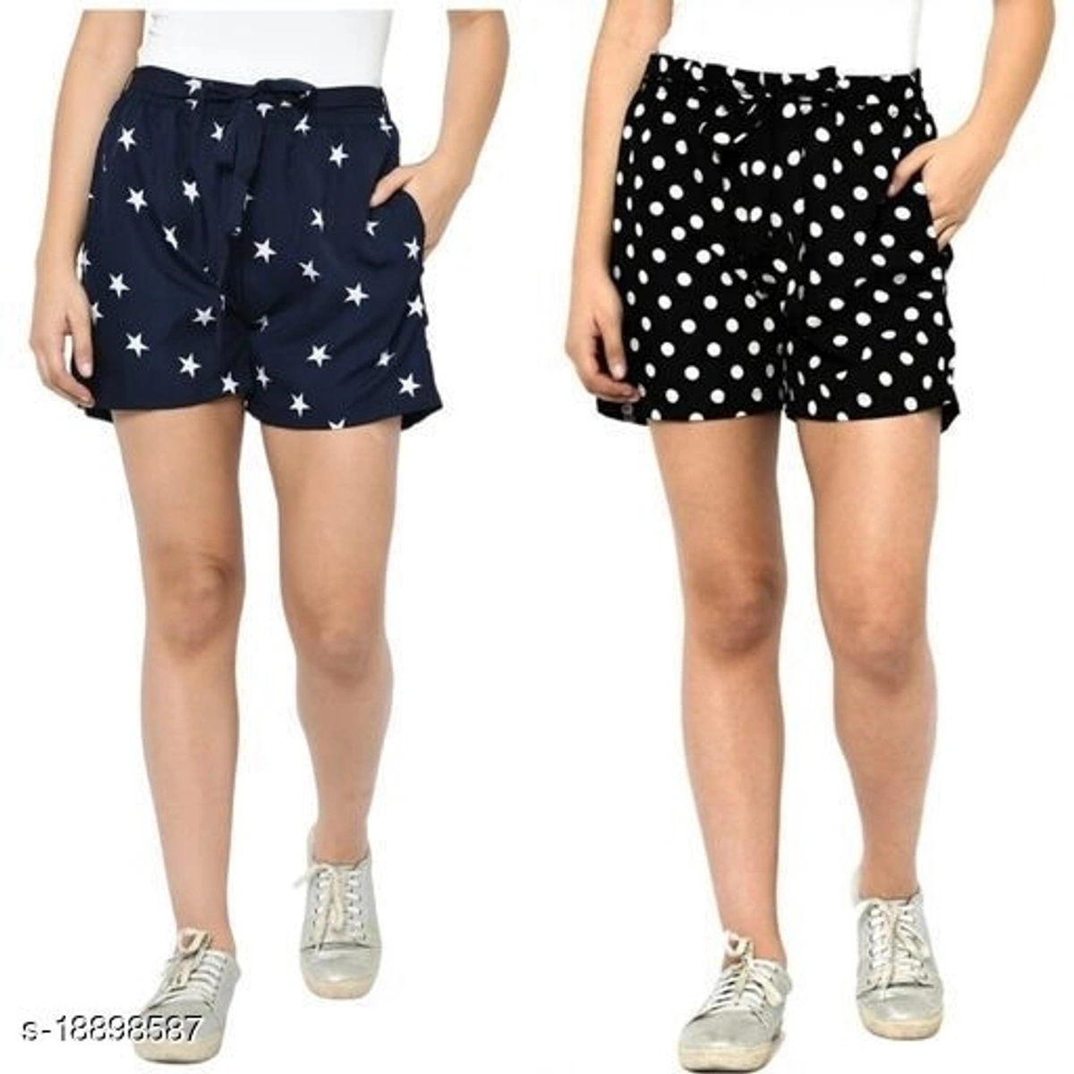 Trendy Women's Shorts Name: Trendy Women's Shorts Fabric: Crepe Pattern: Printed Multipack: 2 Sizes: 26, 28 (Waist Size: 28 in, Length Size: 18 in) 30 (Waist Size: 30 in, Length Size: 18 in) 32 (Waist Size: 32 in, Length Size: 18 in) 34 (Waist Size: 34 in, Length Size: 18 in) 36 (Waist Size: 36 in, Length Size: 18 in) 38 (Waist Size: 38 in, Length Size: 18 in) 40 (Waist Size: 40 in, Length Size: 18 in) Country of Origin: India