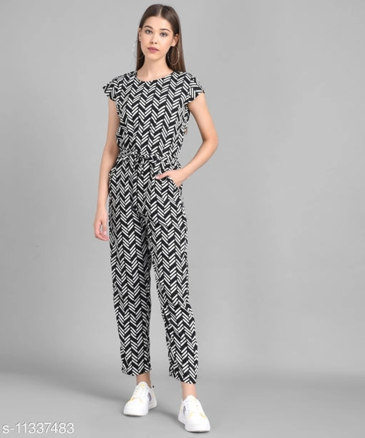 Vivient Black Line Printed Front Knot Jumpsuits Name: Vivient Black Line Printed Front Knot Jumpsuits Fabric: Crepe Sleeve Length: Short Sleeves Pattern: Printed Multipack: 1 Sizes: S (Bust Size: 36 in, Length Size: 48 in, Waist Size: 36 in) M (Bust Size: 38 in, Length Size: 48 in, Waist Size: 38 in) L (Bust Size: 40 in, Length Size: 48 in, Waist Size: 40 in) XL (Bust Size: 42 in, Length Size: 48 in, Waist Size: 42 in) Country of Origin: India