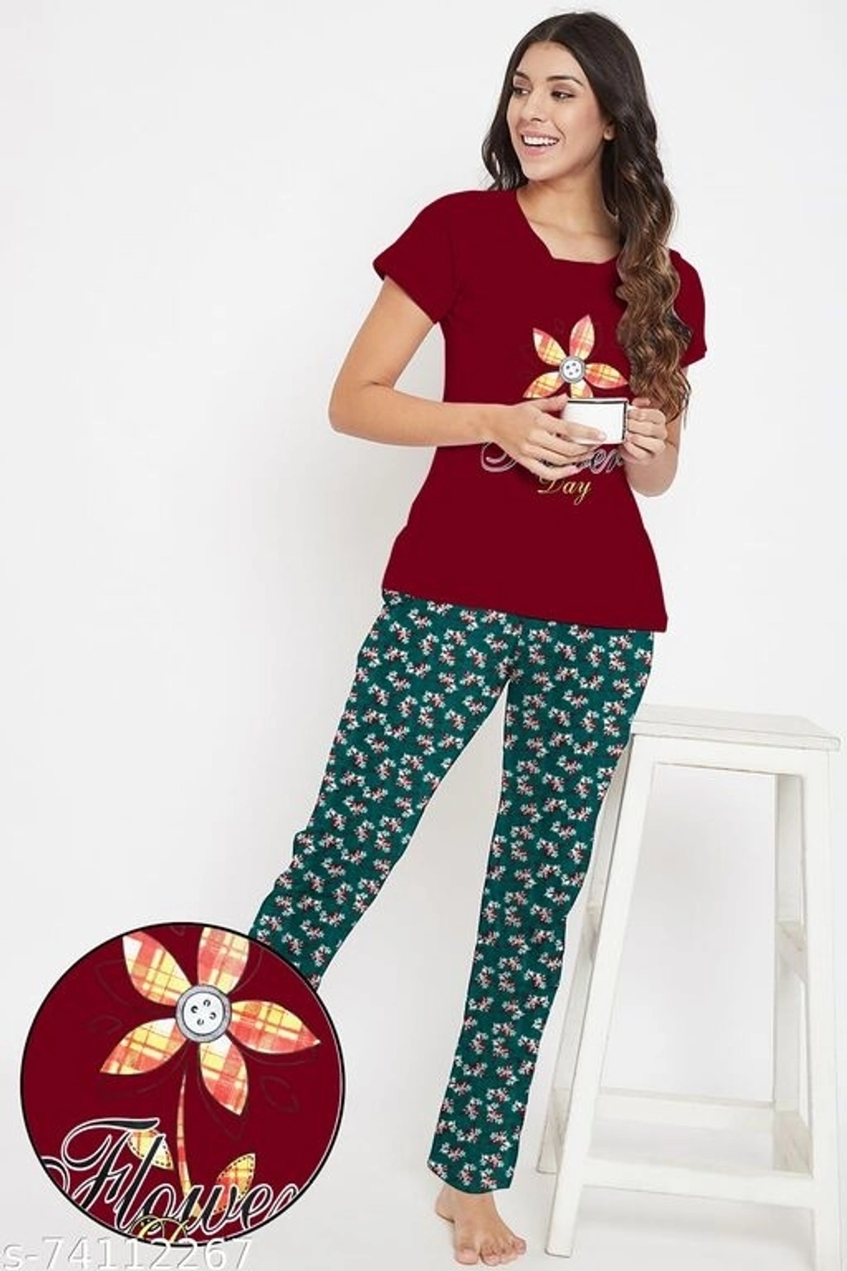 Vkf Ladies Half Sleeve T shirt With Printed Pyjama Pant Set Nightsuits Name: Vkf Ladies Half Sleeve T shirt With Printed Pyjama Pant Set Nightsuits Top Fabric: Cotton Bottom Fabric: Cotton Blend Top Type: Tshirt Bottom Type: Pyjamas Sleeve Length: Short Sleeves Pattern: Printed Multipack: 2 Sizes: S (Top Bust Size: 34 in, Top Length Size: 24 in, Bottom Waist Size: 26 in, Bottom Length Size: 39 in) XL (Top Bust Size: 40 in, Top Length Size: 27 in, Bottom Waist Size: 29 in, Bottom Length Size: 42 in) L (Top Bust Size: 38 in, Top Length Size: 26 in, Bottom Waist Size: 28 in, Bottom Length Size: 41 in) M (Top Bust Size: 36 in, Top Length Size: 25 in, Bottom Waist Size: 27 in, Bottom Length Size: 40 in) XXL (Top Bust Size: 42 in, Top Length Size: 28 in, Bottom Waist Size: 30 in, Bottom Length Size: 43 in) 100% Cotton