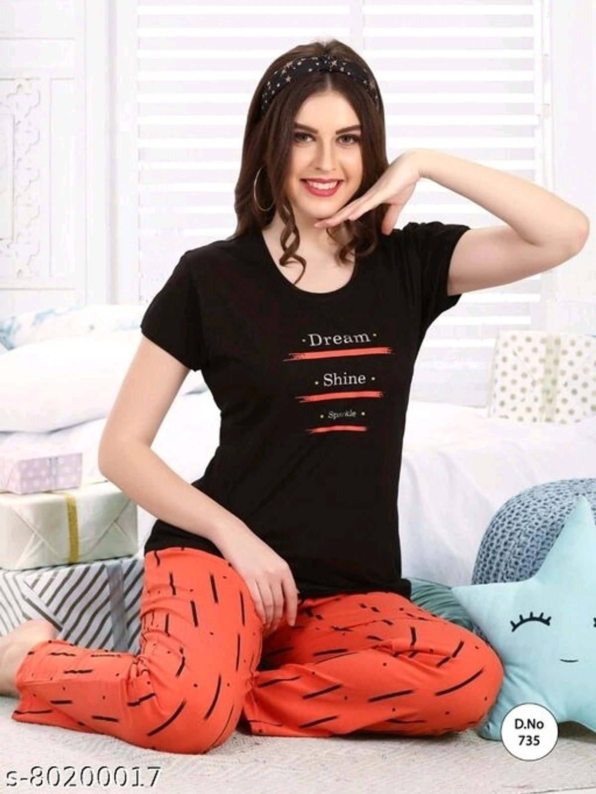 Womans Nightsuit & Loungewear Name: Womans Nightsuit & Loungewear Top Fabric: Hosiery Bottom Fabric: Hosiery Top Type: Tshirt Bottom Type: Pyjamas Sleeve Length: Short Sleeves Pattern: Printed Multipack: 1 Sizes: S (Top Bust Size: 36 in, Top Length Size: 25 in, Bottom Waist Size: 23 in, Bottom Length Size: 38 in) XL (Top Bust Size: 42 in, Top Length Size: 28 in, Bottom Waist Size: 26 in, Bottom Length Size: 41 in) L (Top Bust Size: 40 in, Top Length Size: 27 in, Bottom Waist Size: 25 in, Bottom Length Size: 40 in) M (Top Bust Size: 38 in, Top Length Size: 26 in, Bottom Waist Size: 24 in, Bottom Length Size: 39 in) XXL (Top Bust Size: 44 in, Top Length Size: 29 in, Bottom Waist Size: 27 in, Bottom Length Size: 42 in) Soft & Comfort Hosiery Cotton For Womans & Girls