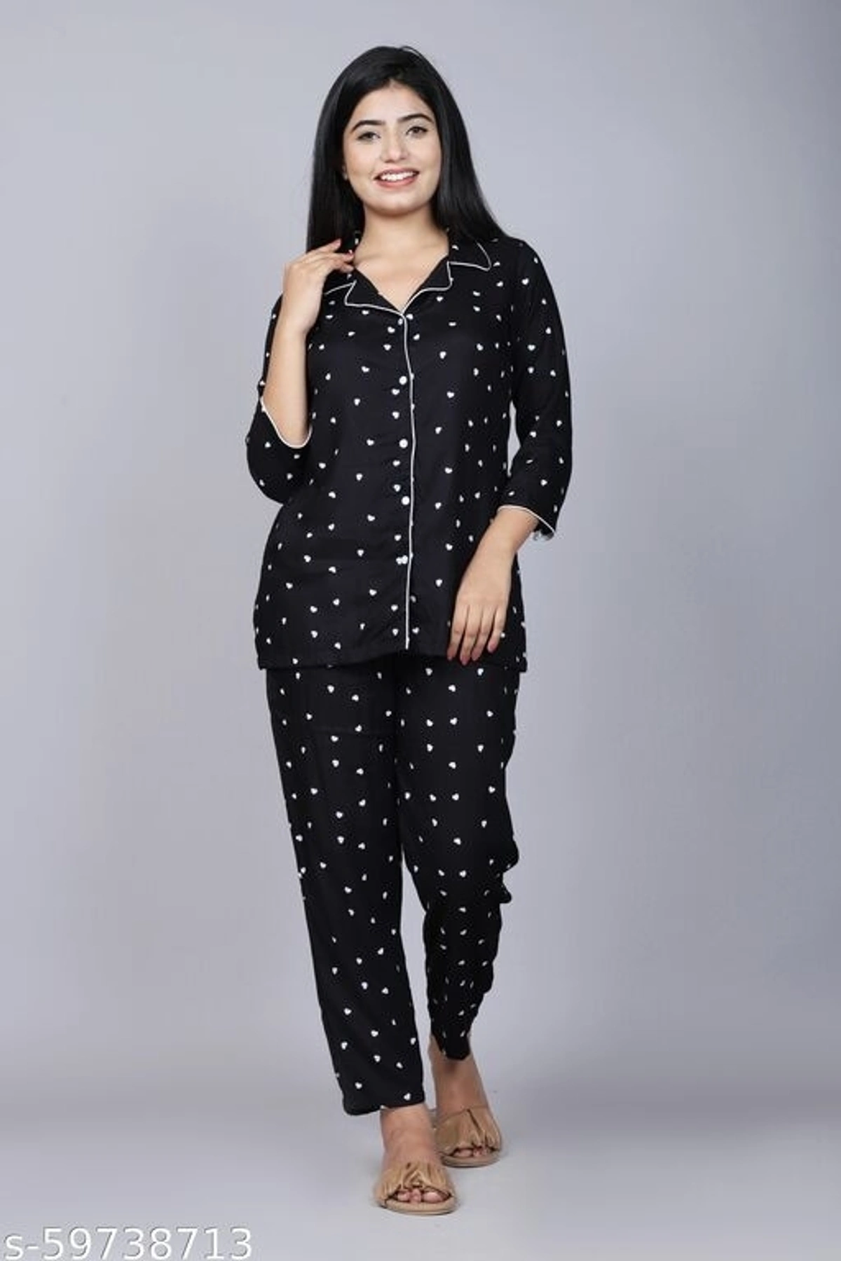Women Black Shirt & Pyjama nightdress Name: Women Black Shirt & Pyjama nightdress Fabric: Rayon Sleeve Length: Three-Quarter Sleeves Pattern: Printed Multipack: 1 Add ons: Bottom Sizes: S (Bust Size: 38 in, Length Size: 40 in) XL (Bust Size: 38 in, Length Size: 40 in) L (Bust Size: 36 in, Length Size: 40 in) M (Bust Size: 36 in, Length Size: 40 in) XXL (Bust Size: 40 in, Length Size: 40 in) Soft and Stylish Rayon Nightwear for This pyjama set is comfortable for both sleep and relaxing time.