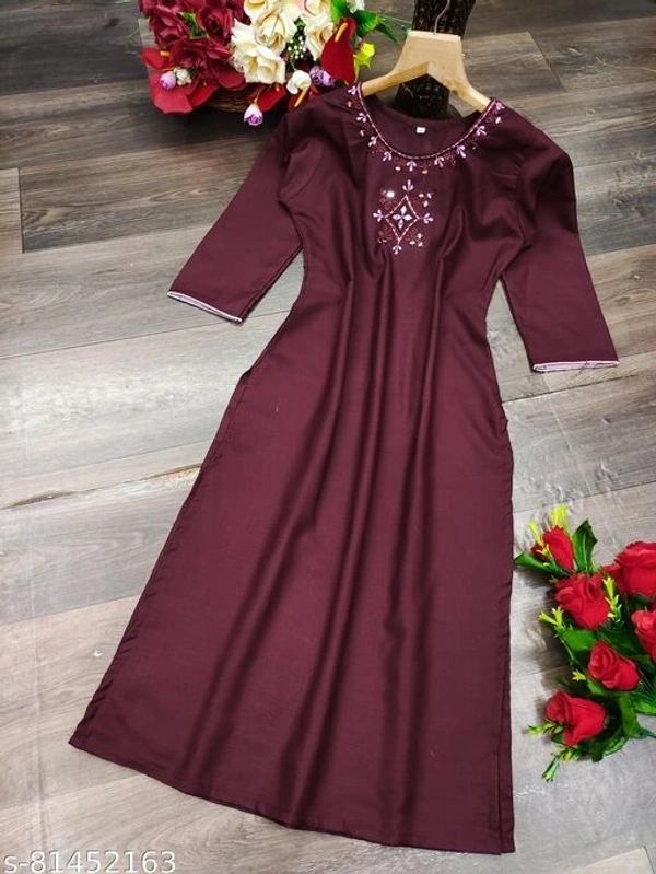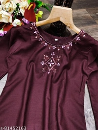 This Wine Embroidery with original Mirror Kurti By FIDHARA is crafted in Handloom Cotton With Regular Sleeve And Round Neckline With Flared Silhouette This Kurti is Perfect For A all weather Brunch Look.