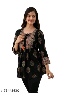 Women Rayon Printed Black Top Name: Women Rayon Printed Black Top Fabric: Rayon Sleeve Length: Three-Quarter Sleeves Pattern: Printed Multipack: 1 Sizes: XL (Bust Size: 42 in, Length Size: 27 in) L (Bust Size: 40 in, Length Size: 26 in) XXL (Bust Size: 44 in, Length Size: 28 in) M (Bust Size: 38 in, Length Size: 25 in) Take a top look to a new level wearing this best coloured top from the quality blended fabric, this top is highly comfortable. Country of Origin: India free delivery return policy 6 days