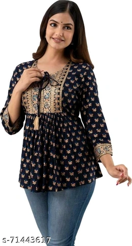 Women Rayon Printed Navy Blue Top Name: Women Rayon Printed Navy Blue Top Fabric: Rayon Sleeve Length: Three-Quarter Sleeves Pattern: Printed Multipack: 1 Sizes: XL (Bust Size: 42 in, Length Size: 27 in) L (Bust Size: 40 in, Length Size: 26 in) M (Bust Size: 38 in, Length Size: 25 in) XXL (Bust Size: 44 in, Length Size: 28 in) Take a top look to a new level wearing this best coloured top from the quality blended fabric, this top is highly comfortable. Country of Origin: India free delivery return policy 6 days