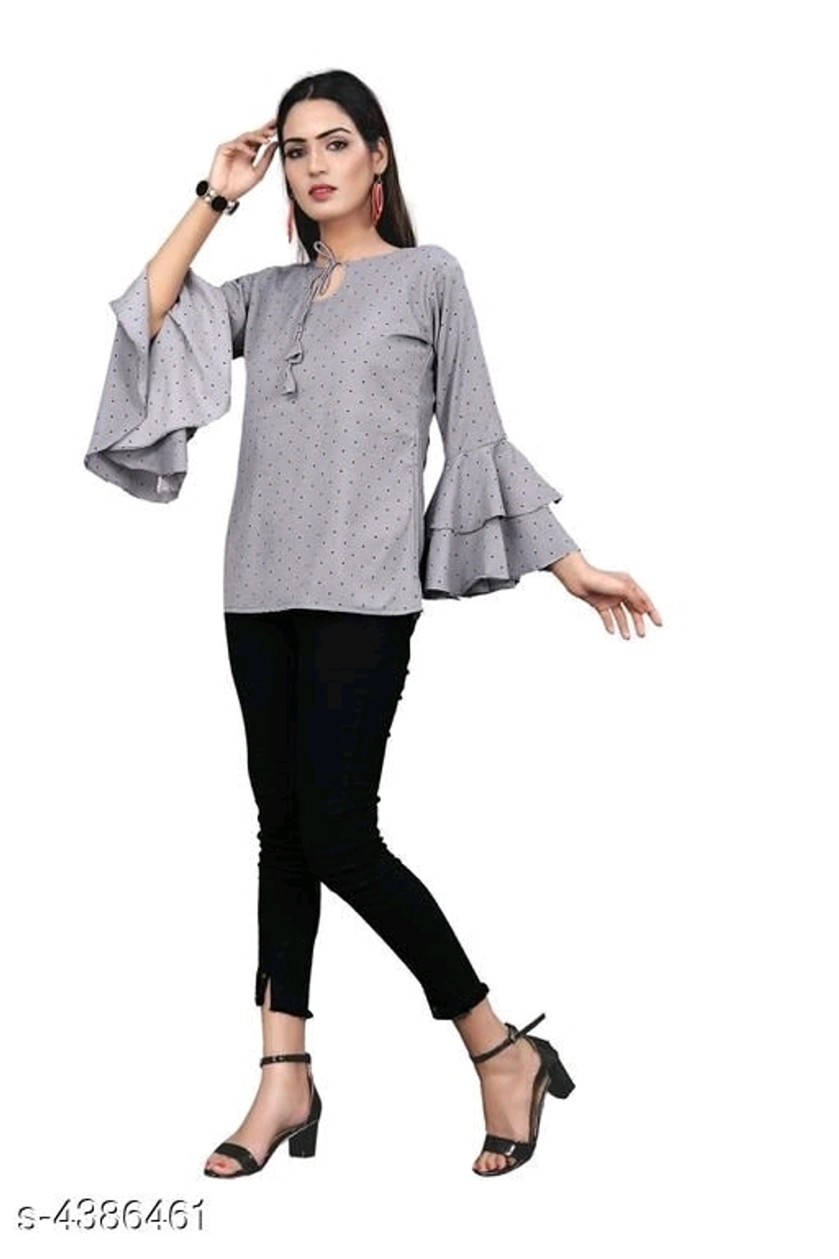 Women's Printed Grey Crepe Top Name: Women's Printed Grey Crepe Top Fabric: Crepe Sleeve Length: Three-Quarter Sleeves Pattern: Printed Multipack: 1 Sizes: S (Bust Size: 36 in Length Size: 28 in) XL (Bust Size: 42 in Length Size: 28 in) L (Bust Size: 40 in Length Size: 28 in) M (Bust Size: 38 in Length Size: 28 in) XXL (Bust Size: 44 in Length Size: 28 in) Country of Origin: India free delivery return policy 6 days