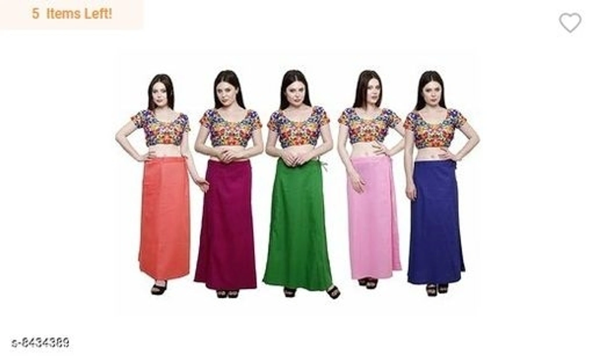 WOMENS PURE COTTON PETTICOAT PACK OF 5 Name: WOMENS PURE COTTON PETTICOAT PACK OF 5 Fabric: Cotton Pattern: Solid Multipack: 5 Sizes: 26, 28, 30, 32, 34, 36, 38, 40, 42, Free Size (Waist Size: 20 in, Length Size: 40 in) Country of Origin: India