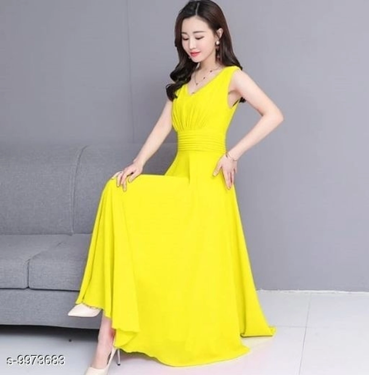 Women's Yellow V-Neck Long Dress Name: Women's Yellow V-Neck Long Dress Fabric: Georgette Sleeve Length: Three-Quarter Sleeves Pattern: Solid Multipack: 1 Sizes: S (Bust Size: 32 in) M (Bust Size: 34 in) L (Bust Size: 36 in) XL (Bust Size: 38 in) Country of Origin: India free and fast delivery return policy 6 days