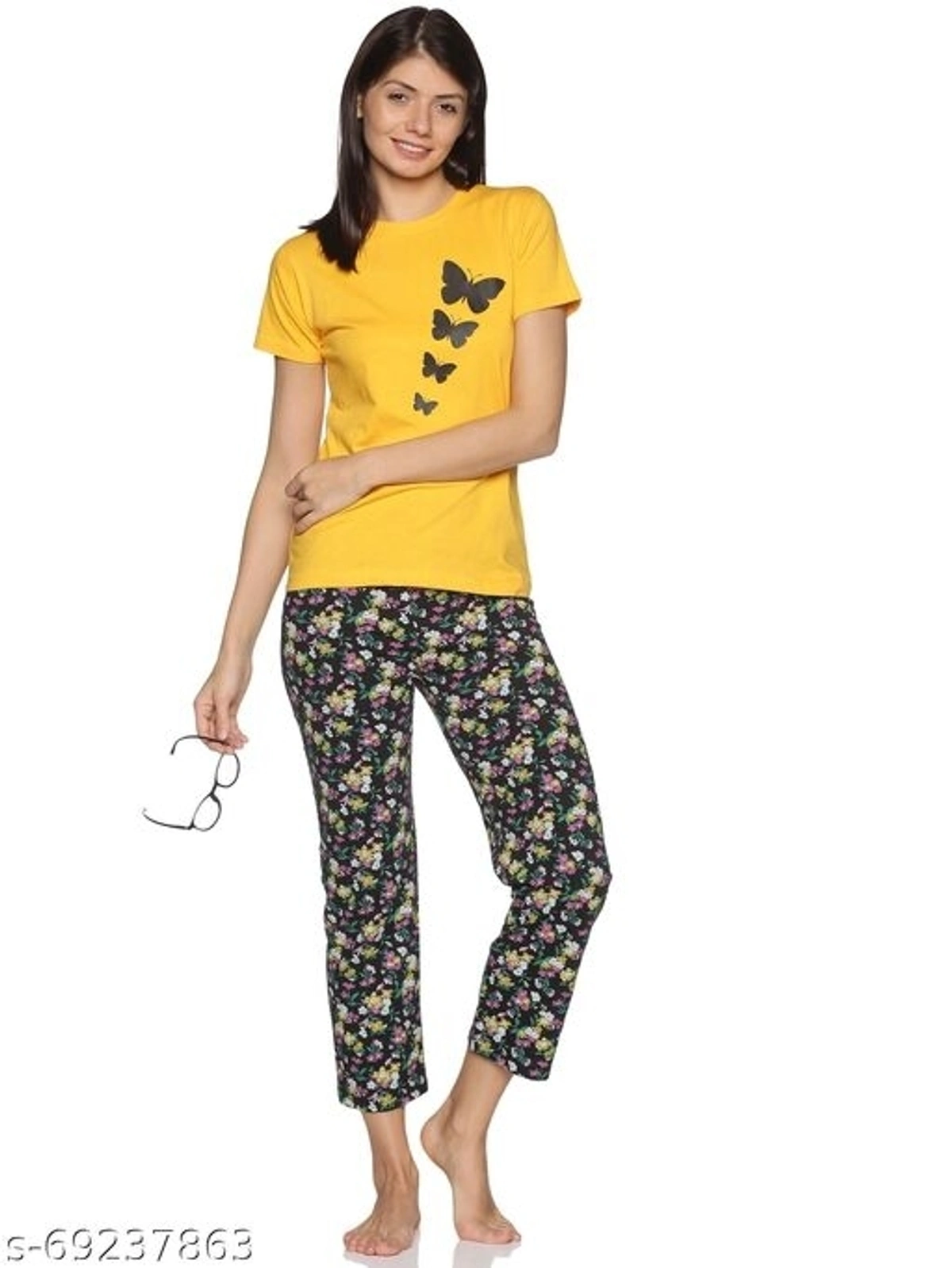 yellow butterfly nightsuit Name: yellow butterfly nightsuit Top Fabric: Cotton Bottom Fabric: Cotton Top Type: Tshirt Bottom Type: Pyjamas Sizes: S (Top Bust Size: 36 in, Top Length Size: 26 in, Bottom Waist Size: 32 in, Bottom Length Size: 37 in) XL (Top Bust Size: 42 in, Top Length Size: 28 in, Bottom Waist Size: 38 in, Bottom Length Size: 40 in) L (Top Bust Size: 40 in, Top Length Size: 28 in, Bottom Waist Size: 36 in, Bottom Length Size: 39 in) M (Top Bust Size: 38 in, Top Length Size: 27 in, Bottom Waist Size: 34 in, Bottom Length Size: 38 in) Country of Origin: India